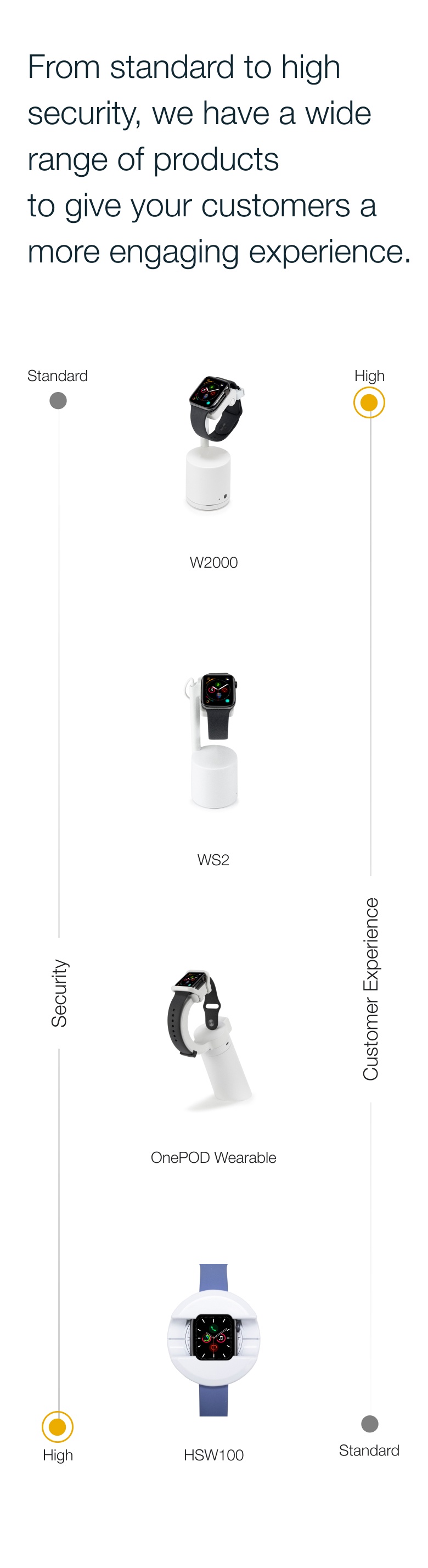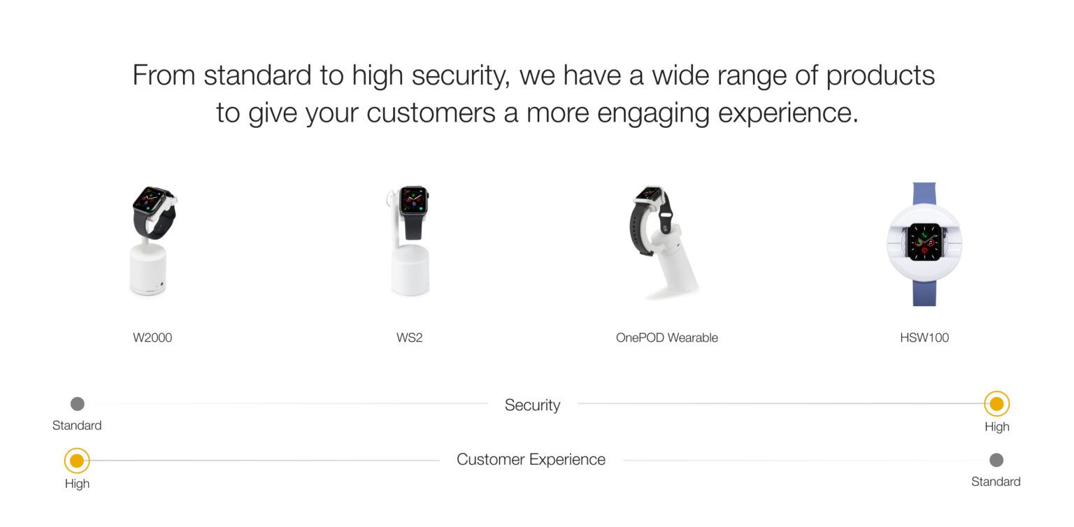 고객이 직접 착용해 볼 수 있는 스마트워치 보안 솔루션을 통해 고객에게 완전히 체험형 쇼핑 경험을 제공하세요.