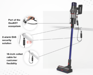 Cable Lock Anchor 18인치 코일 케이블로 연결된 양면 잠금 Cable Lock Anchor . 잠금 장치의 한쪽은 매장 비품에 고정(이름의 유래)되고, 다른 쪽은 상품에 직접 연결됩니다. 고객은 잎사귀 송풍기, 헬멧, 고가 의류 등 다양한 상품을 직접 만져볼 수 있습니다.